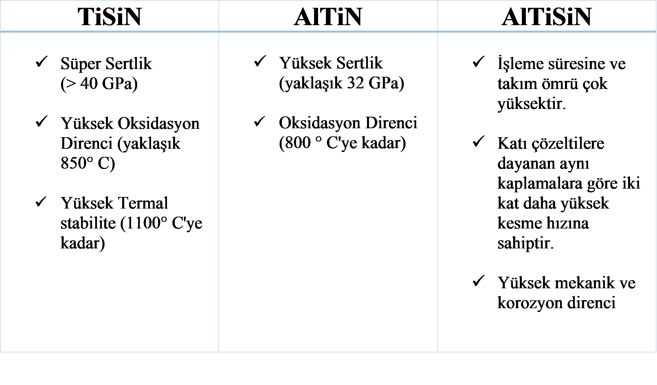 Sektörde en çok kullanılan AlTiN, TiSiN ve AlTiSiN kaplama malzemelerini üretmekteyiz. Üçlü film nitrür talebi, farklı uygulamalardaki (örneğin kaplamalar, havacılık endüstrisi, alet sertleştirme elektronik cihazları vb.) artan talepleri nedeniyle son on yılda artmıştır. Üçlü metal nitrür (örneğin, TiSiN, AlTiN vb.), İkili metal nitrür metallerine kıyasla korozyon koruması, yüksek sertlik, iyi aşınmaya dayanıklılık, düşük sürtünme katsayısı ve yüksek erime noktası gibi bazı gelişmiş özelliklere sahiptir.